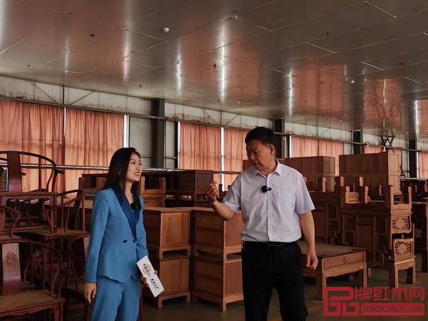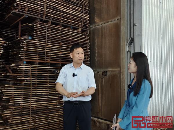 巧夺天工红木董事长张爱冬(右)与主持人探访巧夺天工红木工厂二次烘干房