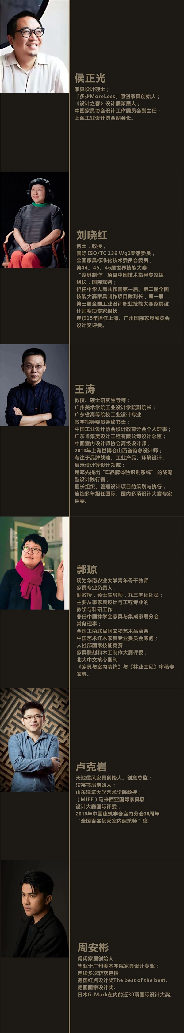 本届大赛初赛评审拥有大咖级评委阵容,大赛由:「多少MoreLess」原创家具创始人侯正光;第44、45、46届世界技能大赛家具制作项目中国技术指导专家组组长、金牌教练刘晓红博士/教授;广州美术学院工业设计学院副院长王涛教授;华南农业大学郭琼副教授;天地儒风家具创始人、创意总监卢克岩;得闲家居创始人周安彬联袂组成初赛专家评审团,以保证评审工作的公平公正。大赛专家评委将用各自在艺术领域的建树和影响力,为本次大赛提供国际化、多元化的视角和专业的指导评审,让我们共同见证50份入围作品的诞生。