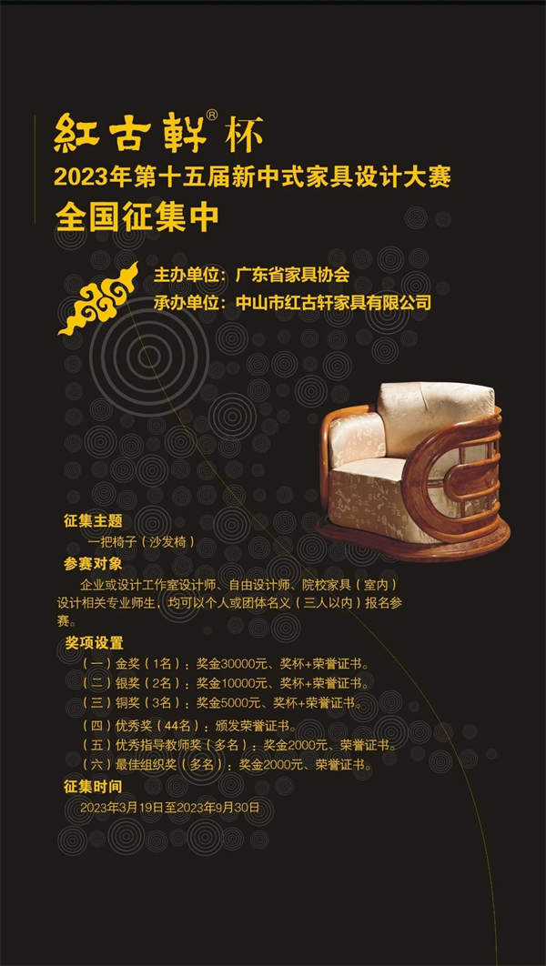 第十五届红古轩杯新中式家具设计大赛,于2023年3月19日,在广州家居设计展正式启动,是广东省家具协会华笔奖旗下最重要的设计活动之一,也是国内首个以新中式为主题的家具设计竞赛。