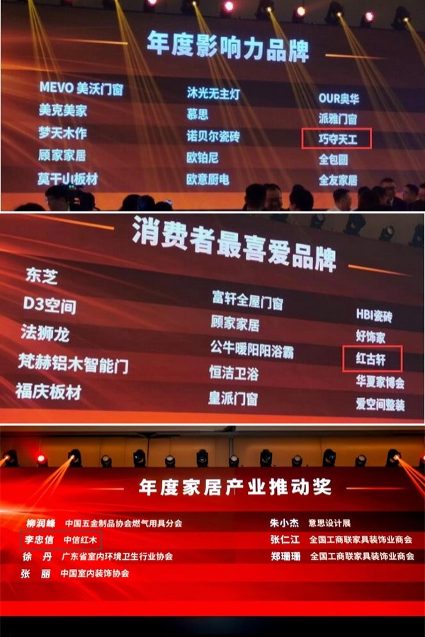 11月23日,由腾讯家居贝壳战略举办的2023年度中国家居品牌力量评选颁奖盛典在广州举行,在家居行业业界人士、媒体朋友、广大消费者的见证下,有3家红木企业入围榜单,其中巧夺天工红木荣获“年度影响力品牌”、红古轩荣获“消费者最喜爱品牌”、中信红木董事长李忠信荣获“年度家居产业推动奖”,再次彰显三家红木品牌强大实力。