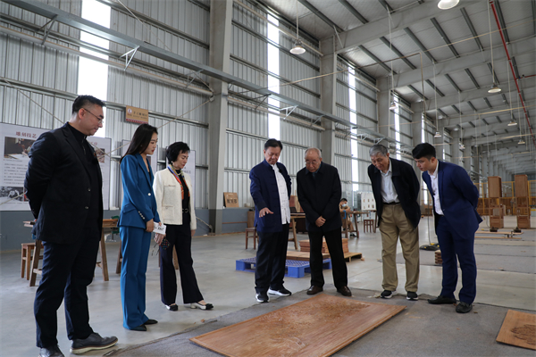 曹静楼主任与中国传统工艺大师、国寿红木创始人中国传统工艺大师、陈国寿(右四),国寿红木创始人夫人伦群章(左三),《红木家具通用技术条件》标准起草人、中国红木家具技术专家曹新民(右三),全国工商联艺术红木家具专业委员会执行会长、《大国匠心&大国工厂》栏目策划人、品牌红木CEO林伟华(右一),国寿红木董事长陈淦凡(左一),央视主持人(左二)参观国寿红木湖北工厂