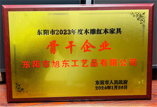 东阳市旭东工艺品有限公司荣获“东阳市2023年度木雕红木家具骨干企业”,彰显强劲实力。