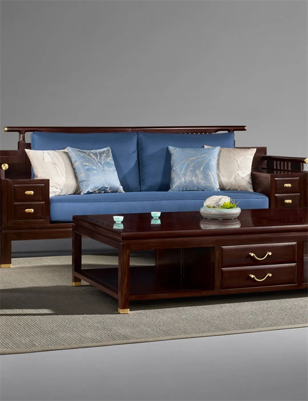 在东遇家居中,深蓝色的阅境沙发成为冬日的一道独特风景。椅面宽大,靠背稍稍向后倾斜,扶手和靠头的边框都是使用厚料制作,腿足一木独开,内翻马蹄腿,秀气却强有力,支撑力满分。