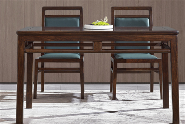 春语餐台以八仙桌为设计基础,线条圆润,桌面攒框装板,中间用矮老连接,比例协调、和谐自然。精选安哥拉紫檀而制,色泽沉郁古朴,纹理清晰细腻,为整体披上了莹莹光泽之感,低调之中自见深厚内涵。