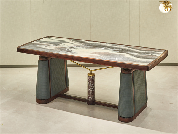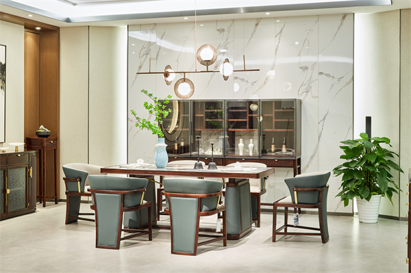 《岳纳餐桌》作为餐厅中的核心元素,承载着一家人的团聚与欢乐,为餐厅带来一份精致与舒适。它采用阔叶黄檀木与大理石混搭,给人一种时尚潮奢的感觉,与新年氛围相得益彰。