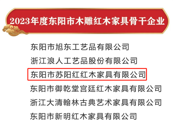 苏阳红红木被授予“东阳市木雕红木家具骨干企业”称号