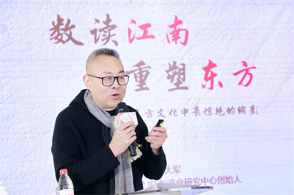 江南生活美学 IP 与产业研究中心创始人、中国书房创始人、书法家、策展人丁大军以《数读江南,重塑东方》为题,通过一系列数据分析了江南地区红木家具市场的现状与发展趋势,提出了重塑东方美学的新思路。从寻找美、发现美、重塑美三个维度去理解当代红木高定的生活场景。