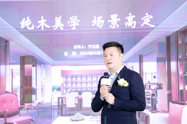 紧接着,东遇家居常务副总于立胜带来了一场主题为《纯木美学 场景高定》的分享。他指出,纯木美学强调的是木材的自然之美和人文之韵,而场景高定则是根据消费者的个性化需求,量身定制出符合其生活方式和审美品味的家居场景。二者的结合,不仅提升了家居产品的艺术价值,也满足了消费者对美好生活的追求。