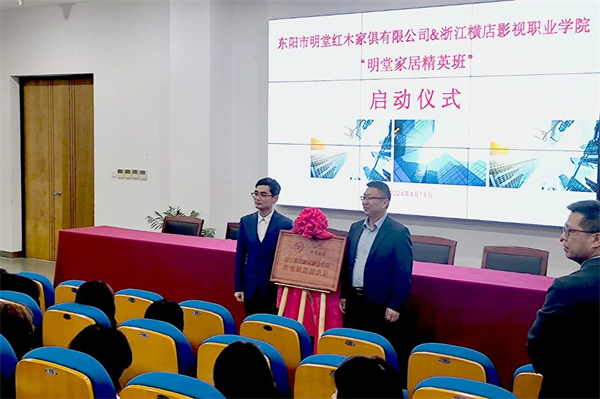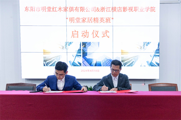 4月18日,明堂家居精英班启动仪式在横店影视学院图书馆报告厅举行。明堂家居副总经理厉飞进、明堂设计院院长高镜伦、明堂设计院教学主任石海静、明堂设计院讲师李家乐、浙江横店影视职业学院党委副书记、校长安华、影视美术学院副院长唐串、组宣合作中心副主任王文虎,以及2023级艺术设计、舞台艺术设计与制作专业学生出席了签约揭牌仪式。