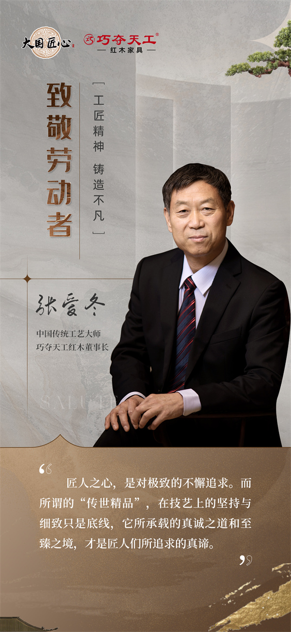 中国传统工艺大师、巧夺天工红木董事长张爱冬匠心语录:匠人之心,是对极致的不懈追求。而所谓的“传世精品”,在技艺上的坚持与细致只是底线,它所承载的真诚之道和至臻之境,才是匠人们所追求的真谛。