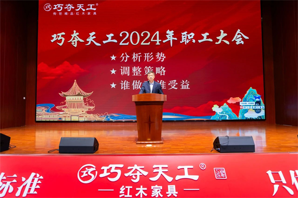 4月25日,巧夺天工红木2024年职工大会在总部大礼堂圆满举行。大会在庄重而热烈的氛围中拉开帷幕,中国传统工艺大师、巧夺天工红木董事长张爱冬,总经理张爱明以及生产厂长刘春明等领导悉数出席,并发表了重要讲话。