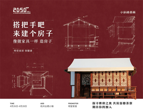 4月26日-28日,在杭州云栖小镇国际会展中心举行的2050大会上,明堂家居发出邀请,诚邀年青人一同探索榫卯奥秘,共筑容膝茶寮。