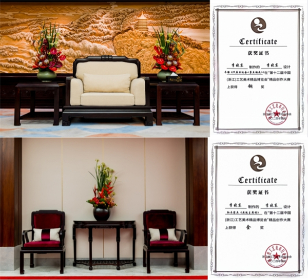 近日,在首届浙江省历史经典产业展暨第十二届中国(浙江)工艺美术精品博览会上,旭东红木参展作品《亚运主席椅》凭借独特设计和卓越品质荣获金奖,《勇立潮头》屏风则以其精湛的雕刻技艺和深刻的文化内涵获得铜奖。
