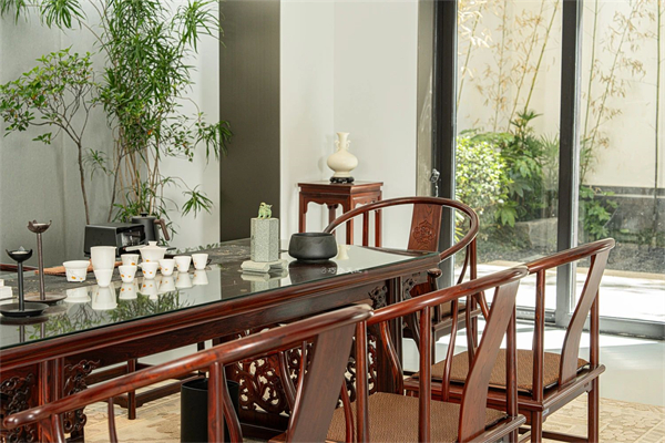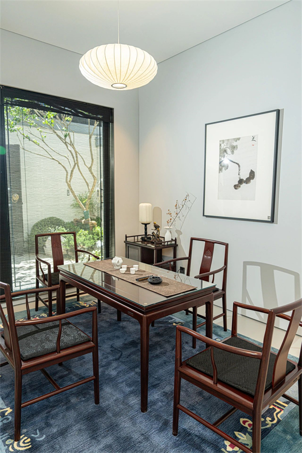 背靠绿意盎然的景观,落地窗引入自然光,将室内外融为一体,营造出优雅而自然的品茗环境。简约设计与古典家具的交融,赋予空间深厚的文化底蕴,成为心灵的归宿。
