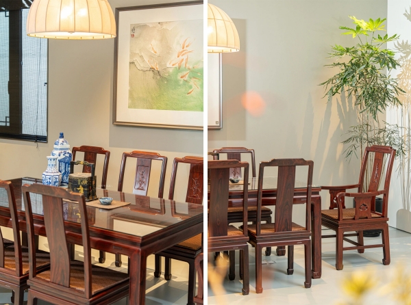 明式的餐椅背上栩栩如生的草木刻画与餐厅一角的细条绿植相互呼应,营造出一种和谐的自然氛围。