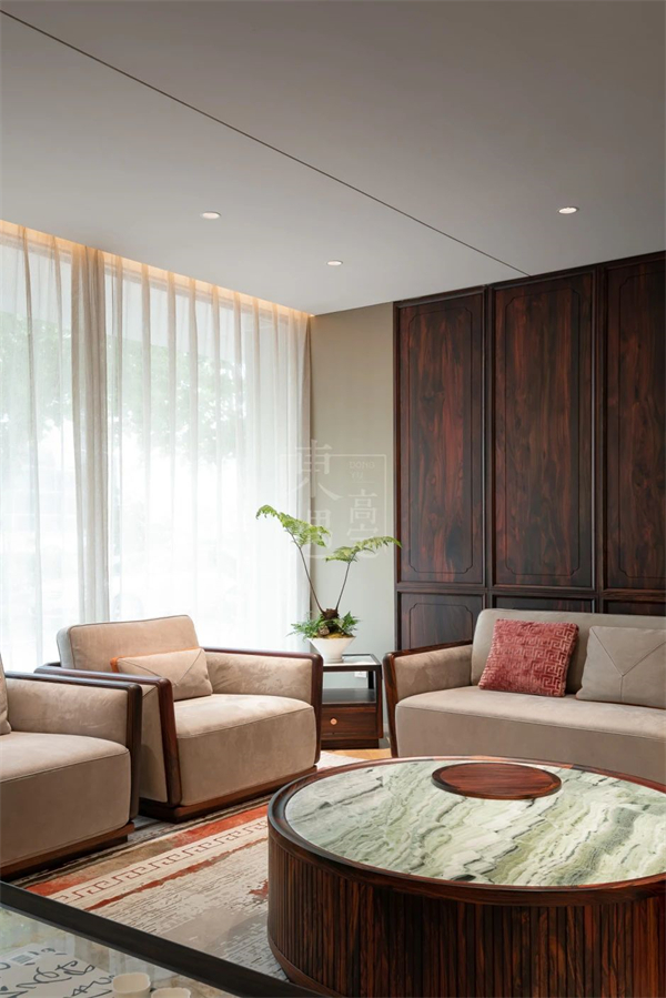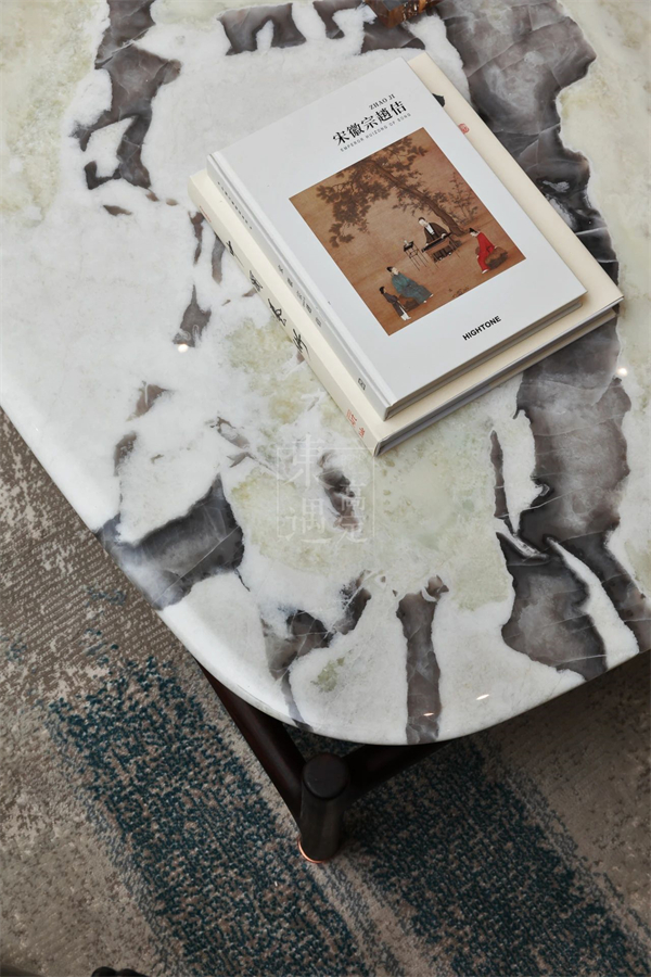 无论是冷翡翠的黑白绿三色交织;还是青玉的通透润泽;亦或是普拉达绿的深海波涛纹理,都成为了东遇高定中的点睛之笔。这些独特的大理石元素与阔叶黄檀木相互融合,共同营造出既个性鲜明又和谐统一的家居氛围。