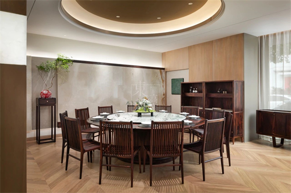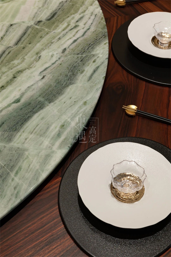 在圆形餐桌的中心,青玉大理石转盘缓缓旋转,如同湖面轻漾的涟漪,将食物与情感温柔地交织在一起。餐桌的木质选用阔叶黄檀木,其深沉的色泽与青玉的浅绿形成鲜明对比,却又在光影的调和下显得异常和谐。