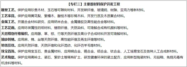 深入挖掘各地特色优秀工艺美术资源。对涉及天然稀缺原材料的工艺美术门类,加强原料保护开发和综合利用。重点支持传承情况好、市场空间大、应用场景多的工艺美术项目,在不影响核心技艺保护传承的情况下,研发生产成本低、来源便利、生态环保的替代材料,强化原材料供应保障能力。