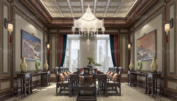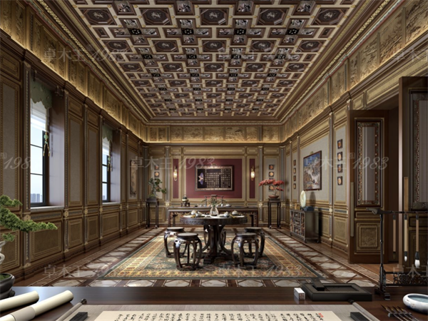 空间设计中,卓木王提取中式传统文化元素,如中国古代纹饰、中式图腾、书法等元素,既彰显着历史文化的魅力,又具备现代东方府宅的审美特质。