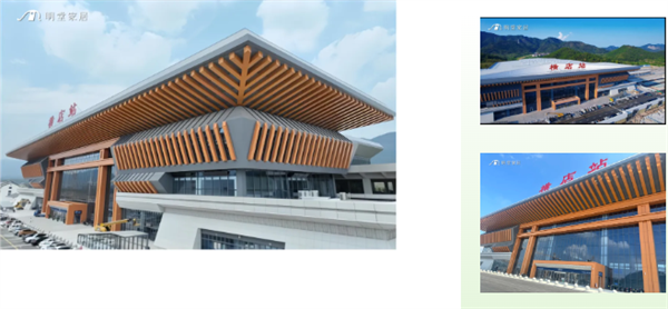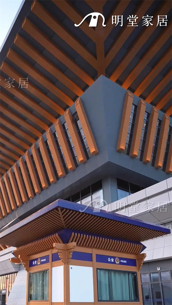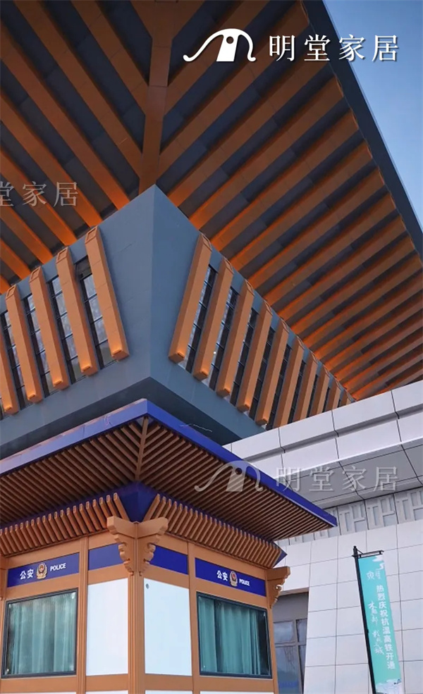 站房外,最引人瞩目的莫过于明堂家居原创设计的站岗亭,站岗亭屋檐造型与站房别无二致,采用原木全榫卯制作,沿袭古建筑中所蕴含的文化精粹,凝聚非遗艺术魅力,融合现代建筑美学,向世界展示“建筑之乡”的非凡魅力。