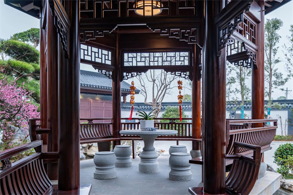 这座庭院是由李忠信红木铭盛整装部设计承建,依照主人家意愿,里面的诗情画意主要以唐木、非柚构建而成,才打造出了一座别具一格的庭院。