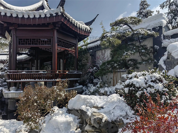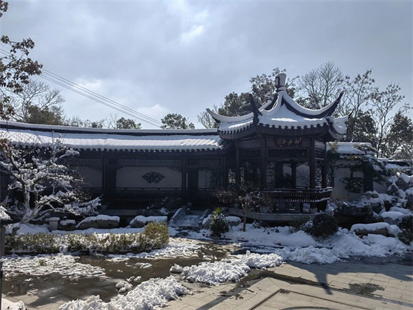 庭院一角,别出心裁地建了一个亭子,如一颗明珠,点缀在院子里。去岁江南见雪时,月底梅花发。亭子银装素裹,别有一番韵味。