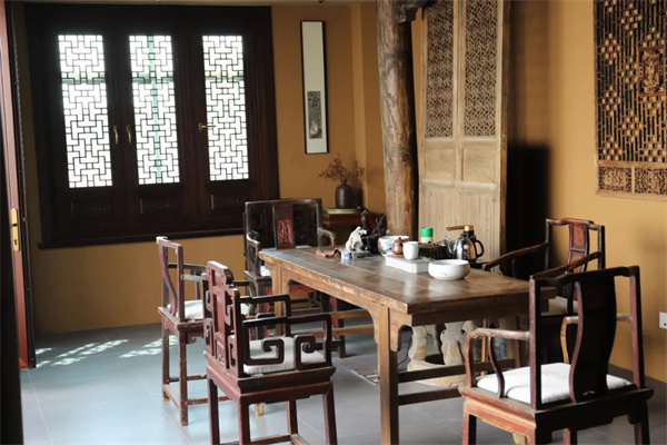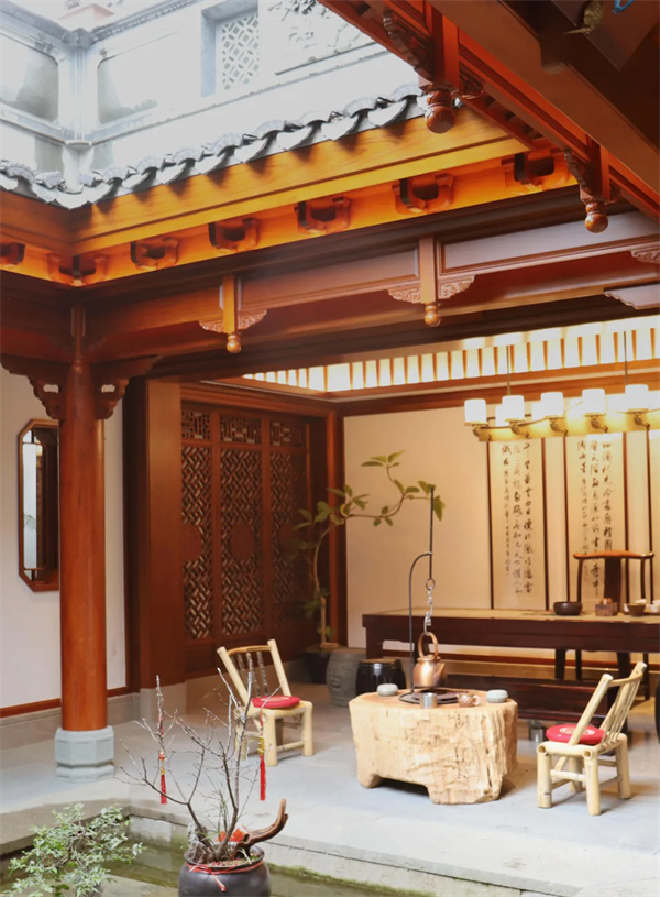 用榫卯工艺制作的访古设计,进行着旧日记忆和现世时光的对话;楼梯转角的老树根,存蓄与延续着古老的印象。