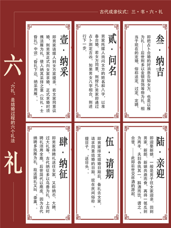 六礼:在中国传统的婚姻习俗中,从议婚至完婚过程中的六种礼节,分别是纳采,问名,纳吉,纳征,请期,亲迎。