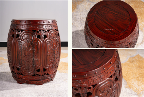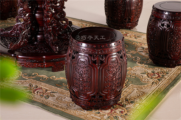 坐墩,圆形腹部较大,其造型类似古代的鼓,被称为“鼓墩”,又因其上方常覆盖一方丝绣之物,也被称做“绣墩”,通体灵巧,线条圆润,端庄秀丽,有女性“婀娜温柔”之美。
