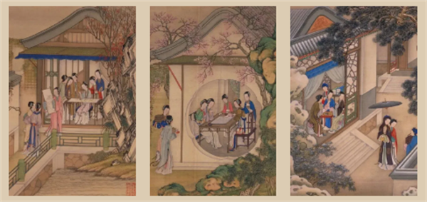 从左至右分别为:文窗刺绣、闲亭对弈、踏雪寻诗