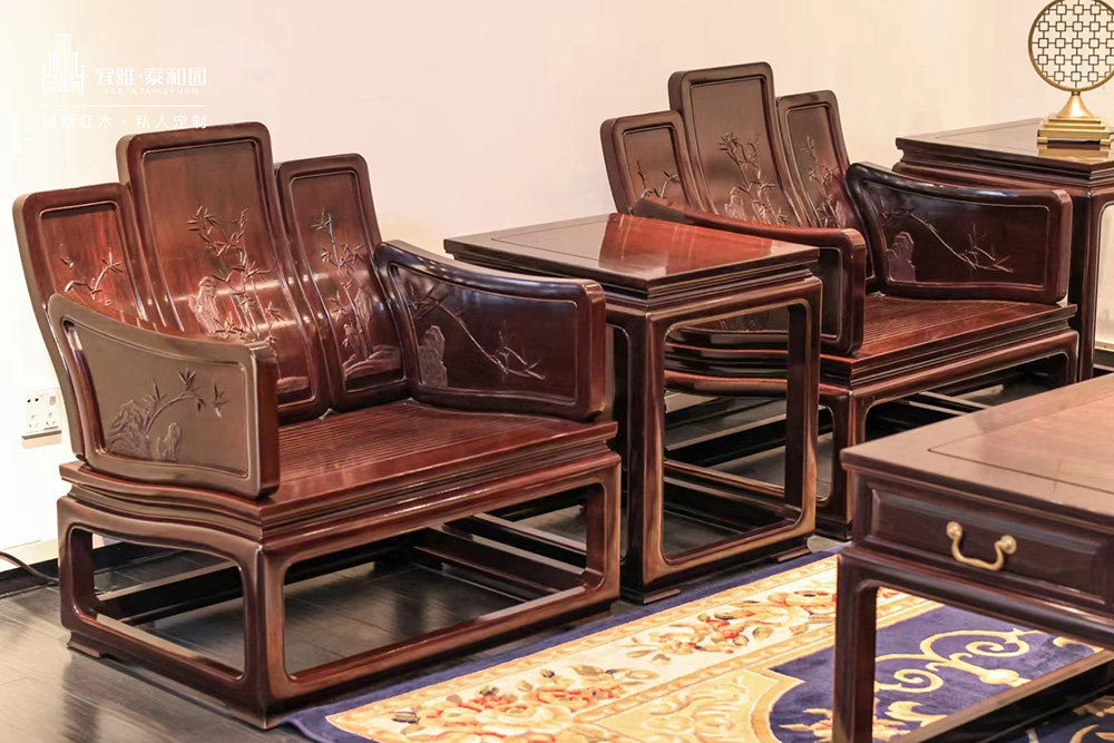泰和园红木家具,讲究艺术美感,私人定制服务从整体家居出发,用丝翎檀雕工艺制作小叶紫檀家具,特别推荐《梅兰竹菊》系列,选材严格,工艺精湛,艺术性强,适合追求高品质生活的人。