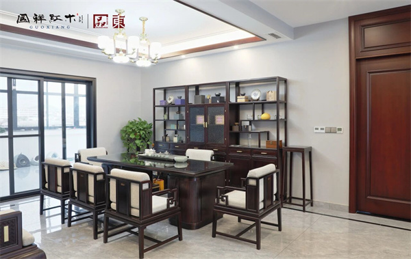 对于追求更高意境的赏月者,一间红木茶室是最佳选择。一套精致的红木茶桌,配以简洁的茶凳,便足以构筑一个淡泊澄澈的意境。