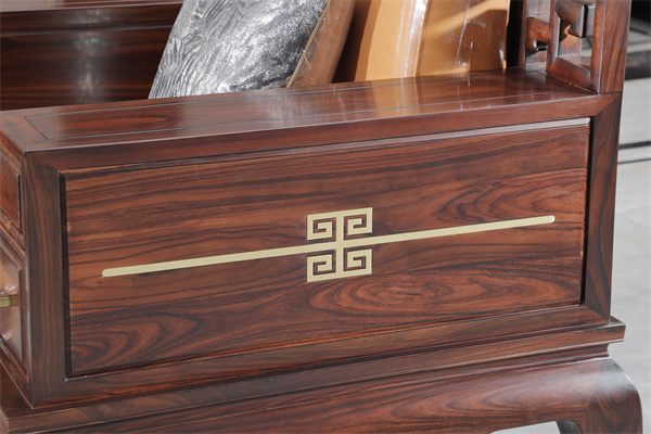 材质,是家具的灵魂。这款沙发选用的阔叶黄檀(黑酸枝),初看并不炫目,却如一位涵养极佳的大家闺秀,气质安静、内敛而含蓄。其色泽是深邃的褐色,纹理自然流畅,如同笔墨在宣纸上随意挥洒而成的水墨画,静心观赏,意境悠远。
