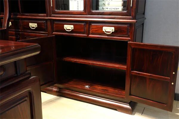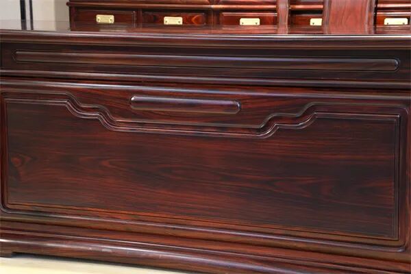 《景程书台》以阔叶黄檀为主材,这种木材质地坚硬,纹理细腻,色泽深沉,是制作高档红木家具的上佳之选。