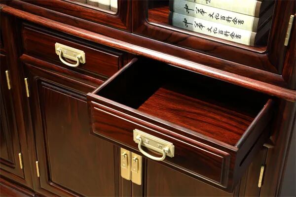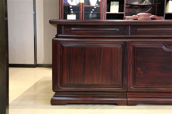 在《景程书桌》中,阔叶黄檀的用料厚重,不仅体现在其坚实的桌面上,更体现在每个细节处,所流露出的大气威严气质。这种气质,正是源于材料本身的质感和工匠们的精湛技艺。