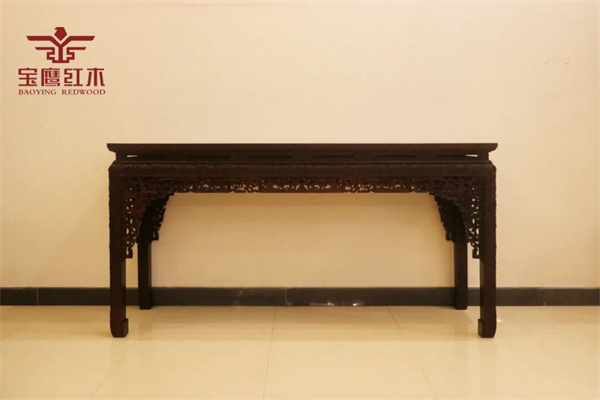 《西番莲条案》:采用小叶紫檀(檀香紫檀)精心制作,通体无拼无补,手工完成。牙条饰以西番莲纹,内翻回纹方马蹄足,整体造型端庄秀雅,具有清中期家具的典型风格。