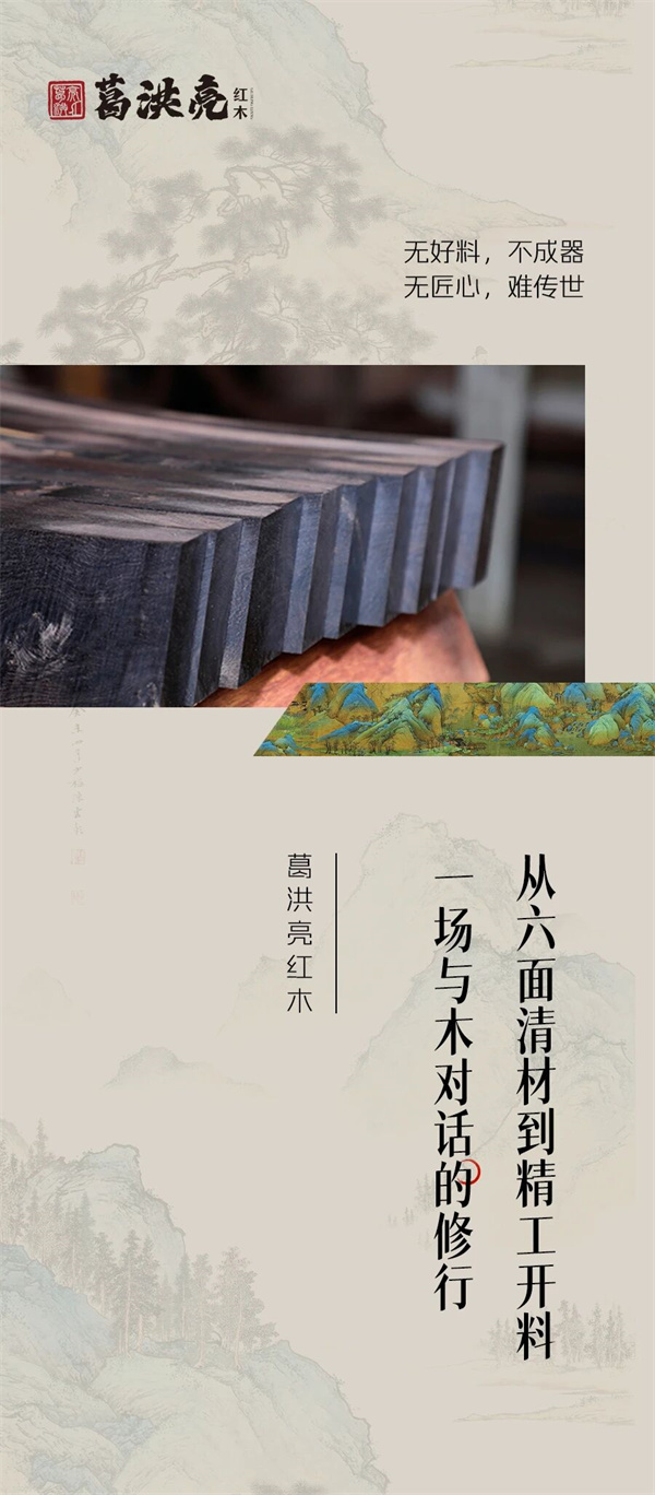 从莽莽林海到雅室厅堂,一块红木的旅程,始于葛洪亮对开料选料近乎偏执的坚守。我们深知,无好料,不成器;无匠心,难传世。