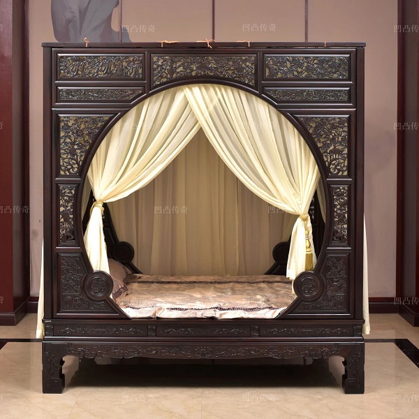这张《花鸟架子床》精选大红酸枝(交趾黄檀)制作而成,是非常经典的双月洞款式,堪称古典家具中的佳品。采用纯榫卯活拆工艺制作而成,尽显古人智慧。两侧双月洞的造型雅致,呼应着花好月圆的美意,承尘部分以十字海棠攒框接工艺制作而成,纹样交错间尽显细腻质感。