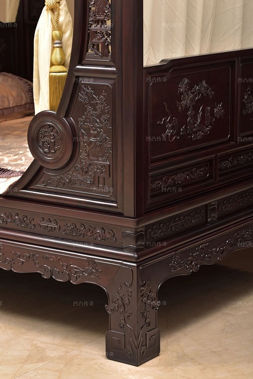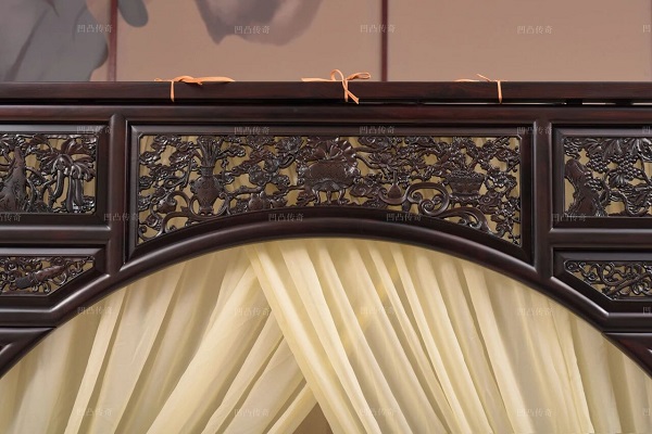挂檐处在两侧透雕葡萄与芭蕉,叶片舒展,藤蔓缠绕,生机盎然。床身雕刻尤为出彩,精雕牡丹、石榴、梅花等各种纹样,寓意美好。床板一木四开,纹理流畅,床身束腰部分采用竹节纹隔开,显得利落又精神。牙板用整颗大料挖制,雕刻的卷草纹寓意生生不息,四条腿用料十足,沉稳落地,绝对是奢华家具的不二之选。