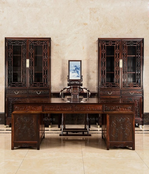 2张书柜重量达到504.8斤,书柜上部采用中式传统窗格雕花设计,灵动自然,书柜抽屉和柜门的螭龙捧纹饰,与书桌相呼应,寓意教子读书、科举高中。这套书房系列,绝对是驰骋商场老板们的不二之选。
