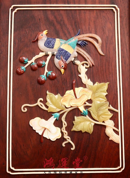 而点睛之笔,则在于背板上运用的“百宝嵌”这一非物质文化遗产技艺。工匠以黄色宝玉嵌作绽放的喇叭花,以碧绿之玉琢为舒展的叶片,花枝修长,一对喜鹊栖息其间,构成一幅生动的“喜上眉梢图”。这项工艺不仅要求极高的美术功底,更考验匠人耐心细致的镶嵌技巧。它没有浮夸的炫技,而是与家具本身的气质相融合,赋予其人文寓意与艺术温度,让家具超越了实用器的范畴,成为可赏可玩的艺术杰作。