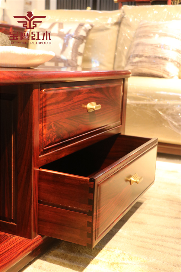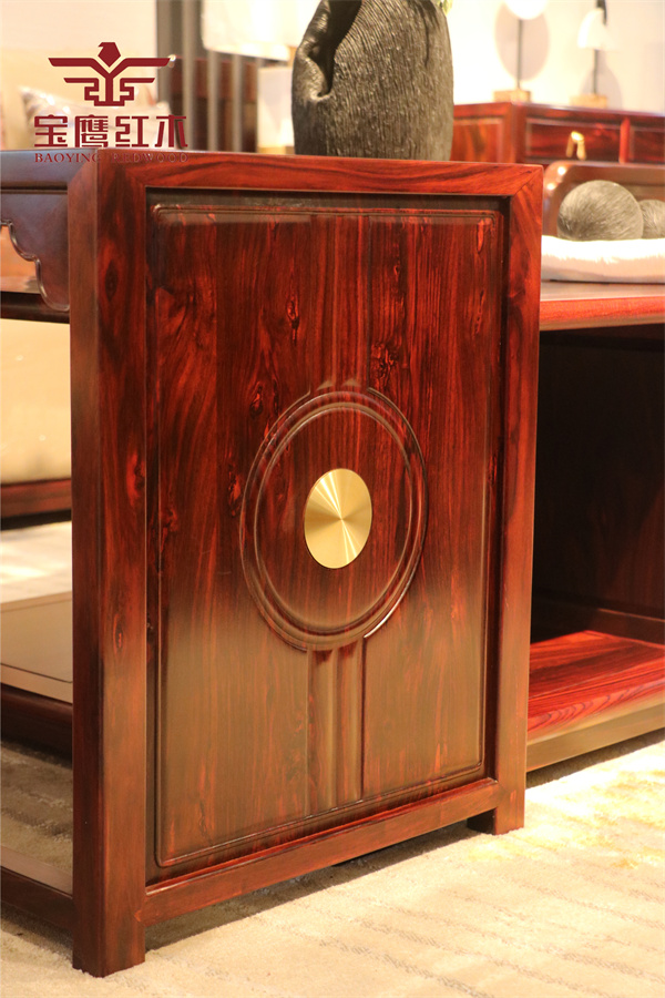 金属点缀:精心搭配的黄铜拉手及装饰配件,为深色的黑酸枝家具增添了恰到好处的光泽质感。这种材质上的巧妙碰撞,既提升了产品的时尚感,又保持了东方的典雅气质。