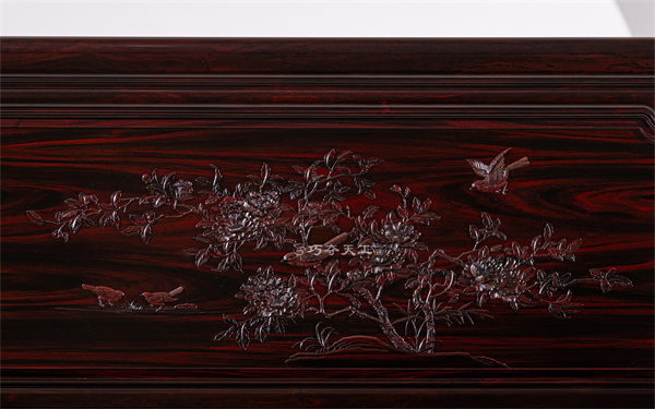 细察雕刻细节,可见从正面到背面、从主框架到辅件,刀工深浅一致、线条流畅、图案清晰。玉兰花瓣的渐变层次、绶带鸟羽翼的纤毫毕现、梅竹枝干的苍劲虬曲均呈现立体生动的视觉效果。精准的刀法控制使图案层次分明、立体感突出,充分展现了巧夺天工工匠群体精湛的雕刻技艺与深厚的艺术造诣。