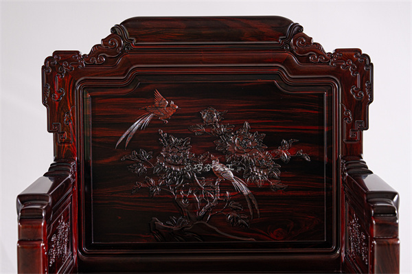 雕刻艺术堪称本品另一大亮点。沙发背板以玉兰、绶带鸟为主体纹样,辅以青竹、红梅构成“富贵祥和、春色满堂”的祥瑞画面。玉兰象征高洁品格,绶带鸟寓意福寿绵长,与梅竹搭配更暗含“齐眉祝寿”的吉庆内涵。纹饰由数名从业数十余载的资深工匠以纯手工雕刻技法完成,耗时百余工时精雕细琢而成。