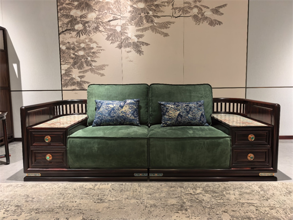 锦绣沙发——宽敞平稳的座位设计体现着东方家居的端庄大气。创新的扶手设计成为可置物的平台,并巧妙设置两个抽屉,极大提升了实用性。平台镶嵌的亚马逊绿奢石与整套沙发的绿色软搭相互呼应,展现着设计的整体性与协调性。