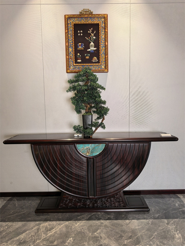 锦绣玄关柜——以半圆的特别形态打破传统,亚马逊绿奢石镶嵌于柜身中心,在玄关处便牢牢吸引入户者的目光。这一设计既保持了东方美学的含蓄,又融入了现代艺术的大胆创新,成为空间中的点睛之笔。