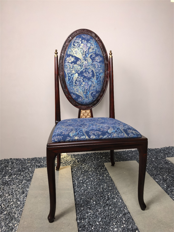 锦绣餐椅——采用高贵典雅的三弯腿设计,融入了法式家具的浪漫风格。椭圆形的靠背搭配蓝色精美花纹布料,在保持新中式韵味的同时,注入了国际化的审美元素。