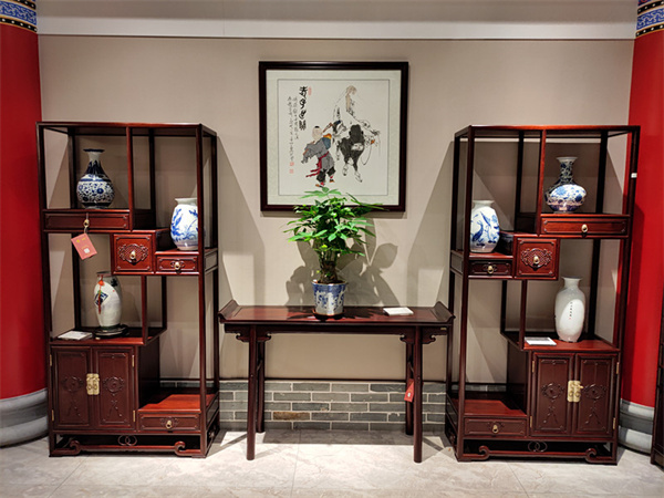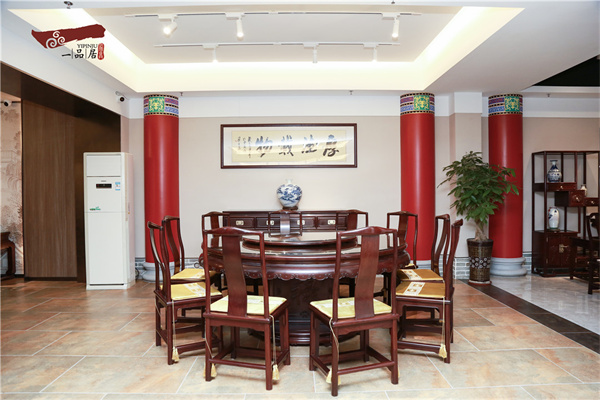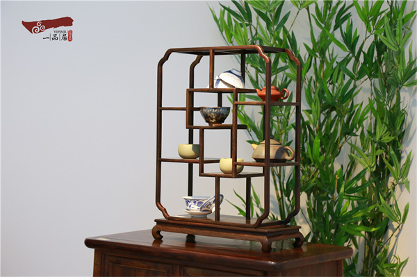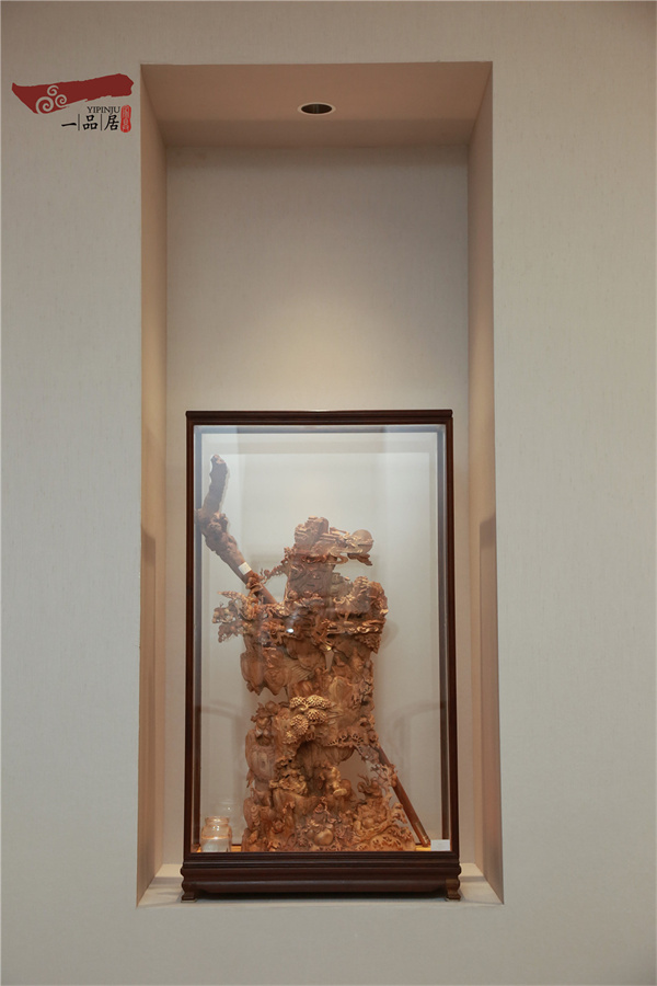 在一品居,您可以看到我们将木雕作品巧妙陈设于墙壁凹处,小型博古架既可收纳茶器,其本身也自成一道风景,让生活的韵味在细节中缓缓流淌。