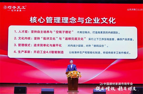 全国工商联艺术红木家具专业委员会专家顾问、《红木家具通用技术条件》标准主要起草人曹新民曾评价:“巧夺天工不仅是山东省的红木家具知名品牌,而且还是一家能充分展现中国传统硬木家具当代制造工艺的代表性企业。”因此,张爱冬的演讲不仅展现了优秀企业的成长轨迹,更彰显了传统行业在新时代的创新突破。其提出的“批评文化”“追根究底文化”等独特管理理念,为行业同仁提供了宝贵的发展样本,引发深入思考。