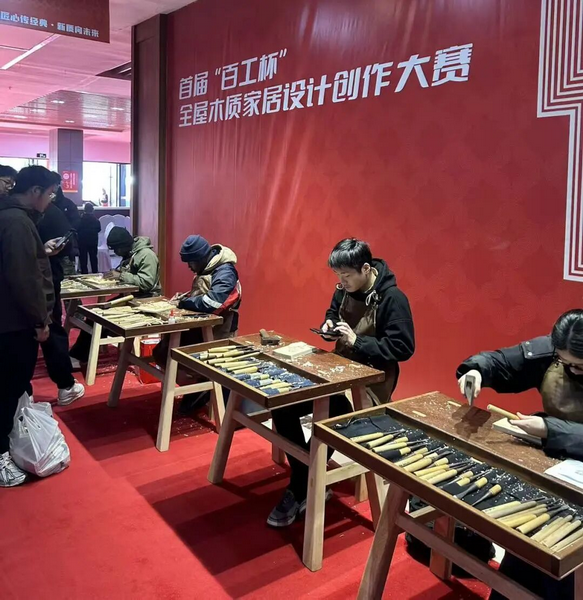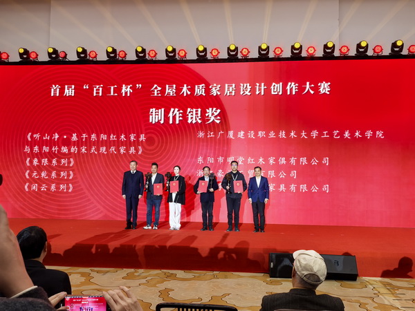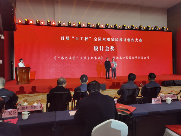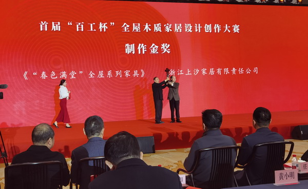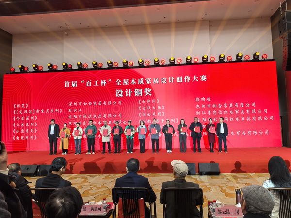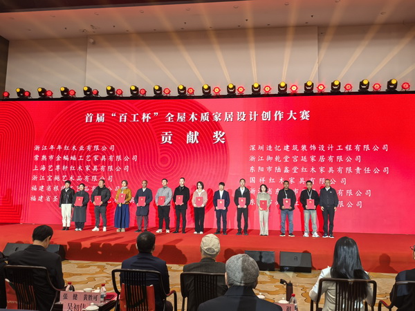现场举行了首届“百工杯”全屋木质家居设计创作大赛颁奖仪式。本次大赛得到全国各地创作者的积极响应,百套作品入围。经赛事发布、作品征集、实物制作等环节,并经评审专家小组评审、评审专家委员会审定,共评选出设计奖金奖1名、银奖6名、铜奖12名、优秀奖20名:制作奖金奖1名、银奖4名、铜奖6名、优秀奖10名。